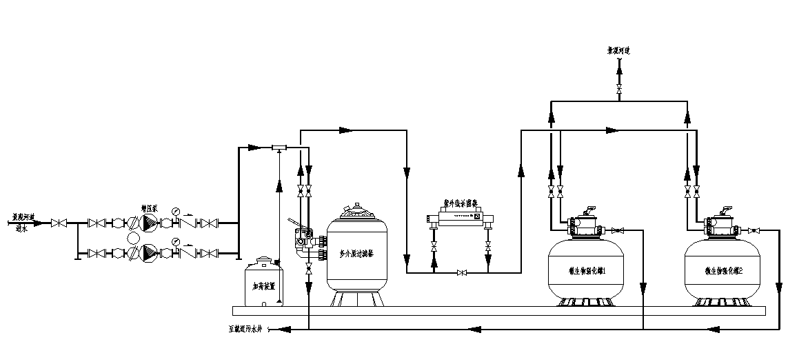 經(jīng)上述設(shè)備凈化后的出水,通過循環(huán)管路送到景觀河道上游,在沿線適當(dāng)位置設(shè)置多個出水口。