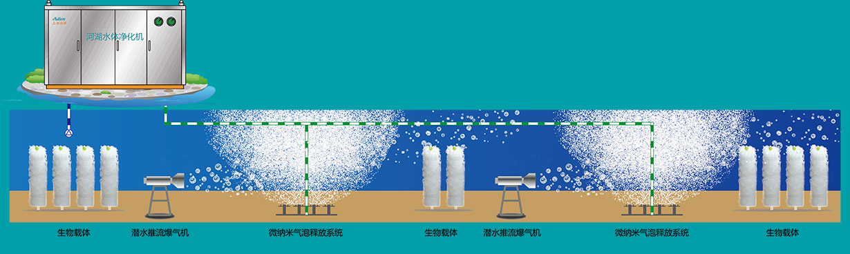 使用產(chǎn)品:A-H河湖水體凈化機,ADQT潛水推流曝氣機,ADWZ微生物載體